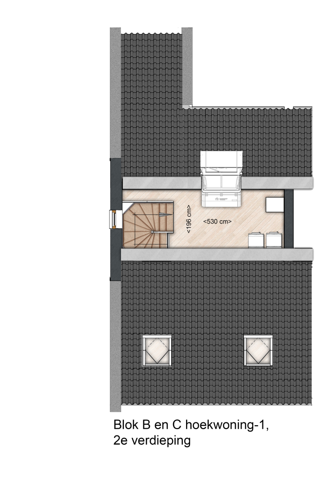2e Verdieping: bergvliering over de hele woningbreedte. Technische en facilitaire ruimte met aansluitingen warmtepomp en mechanische ventilatie. Ook worden hier de aansluitingen voor wasmachine en -droger geplaatst. Een gevelraam geeft daglicht.