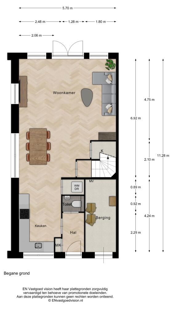 Begane grond: entree met hal. Meterkast. Betegelde toiletruimte met wandcloset en fontein. L-vormige leefruimte met woonkamer aan de achterzijde en keuken aan de voorzijde. Deze wordt casco opgeleverd, met voorbereid leidingwerk. Gesloten wasruimte met aansluitingen wasmachine en -droger. De living heeft dubbele openslaande deuren naar de diepe achtertuin op het zuiden. Extra kamerhoge raampartijen, waarvan één dubbelbreed, in de zijgevel.