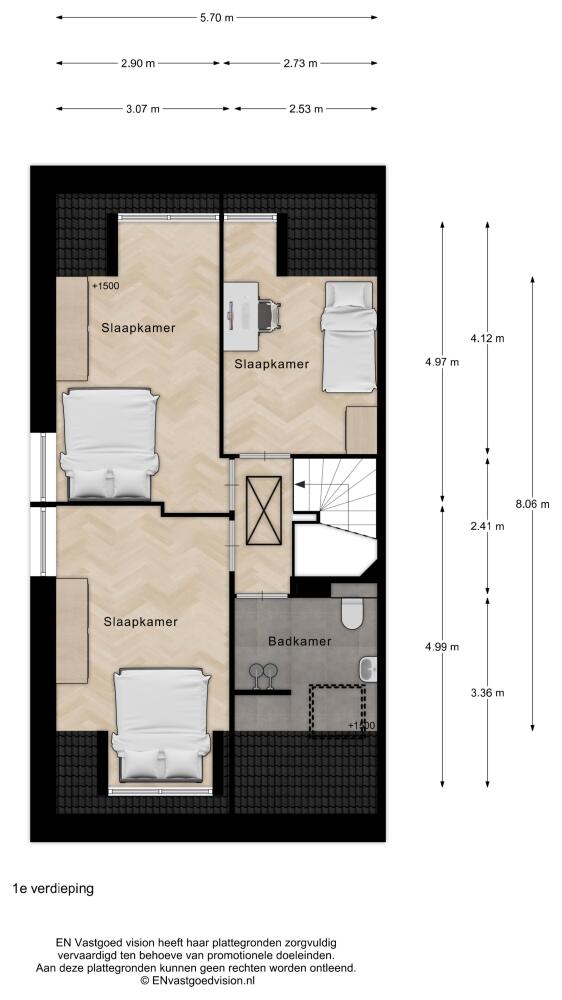 Op de verdieping liggen drie slaapkamers en een nette badkamer, met standaard een wastafel, inloopdouche en tweede toilet. De slaapkamers zijn voorzien van dakramen, twee hebben door de hoekligging dubbele lichtinval door het kamerhoge gevelraam. Een vlizotrap op de overloop leidt naar de bergvliering met stahoogte in het midden van de nok.