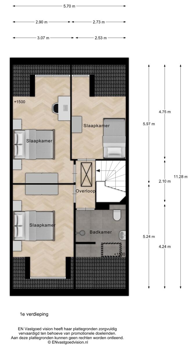 Op de verdieping liggen drie slaapkamers en een nette badkamer, met standaard een wastafel, inloopdouche en tweede toilet. De slaapkamers zijn voorzien van dakkapellen. Een vlizotrap op de overloop leidt naar de bergvliering met stahoogte in het midden van de nok.