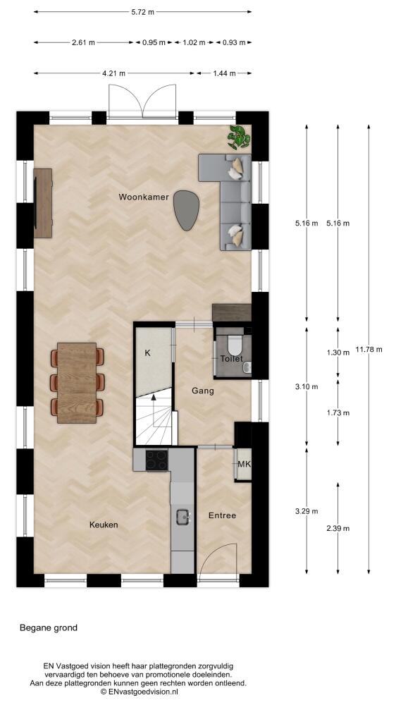 Begane grond: entree met vestibule. Meterkast. Hal. Betegelde toiletruimte met wandcloset en fontein. Trapopgang naar verdieping. Technische ruimte met boiler, vloerverwarmingssysteem en luchtwarmtepomp.