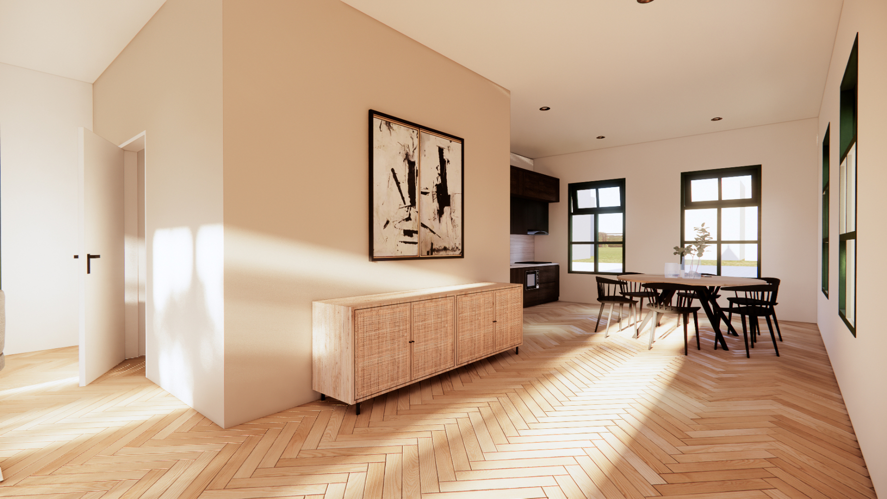 Open leefruimte met woonkamer achter en eetkeuken aan de straatkant. De leefkeuken wordt casco opgeleverd, met voorbereid leidingwerk. De living oriënteert op de achtertuin en de waterkant. Dubbele openslaande deuren en raampartijen aan alle kanten zorgen voor een lichte en ruimtelijke sfeer.