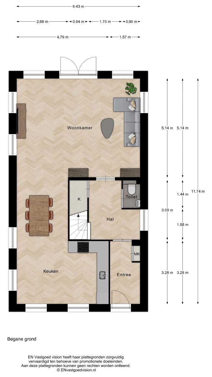 Begane grond: entree met vestibule. Meterkast. Hal met daglichtinval. Betegelde toiletruimte met wandcloset en fontein. Trapopgang naar verdieping. Technische ruimte met boiler, vloerverwarmingssysteem en luchtwarmtepomp. De vloeren vormen de warmtebron.