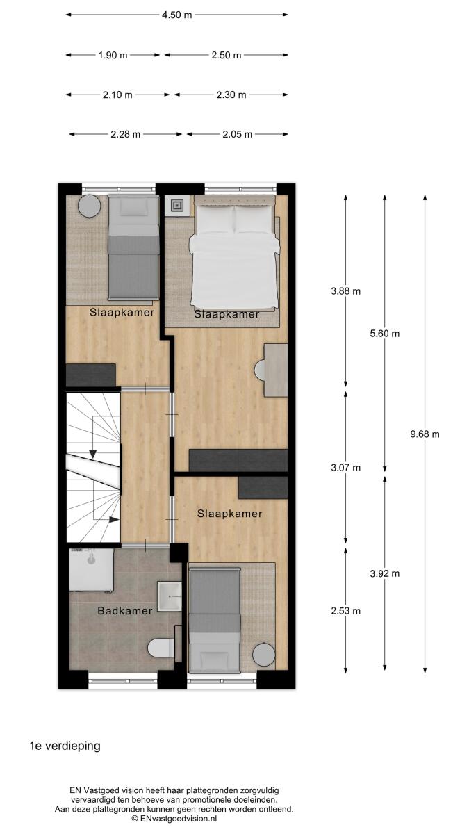 Eerste verdieping: overloop met vaste trap naar tweede verdieping. Drie slaapkamers en badkamer, standaard voorzien van betegeling, wastafel en inloopdouche.