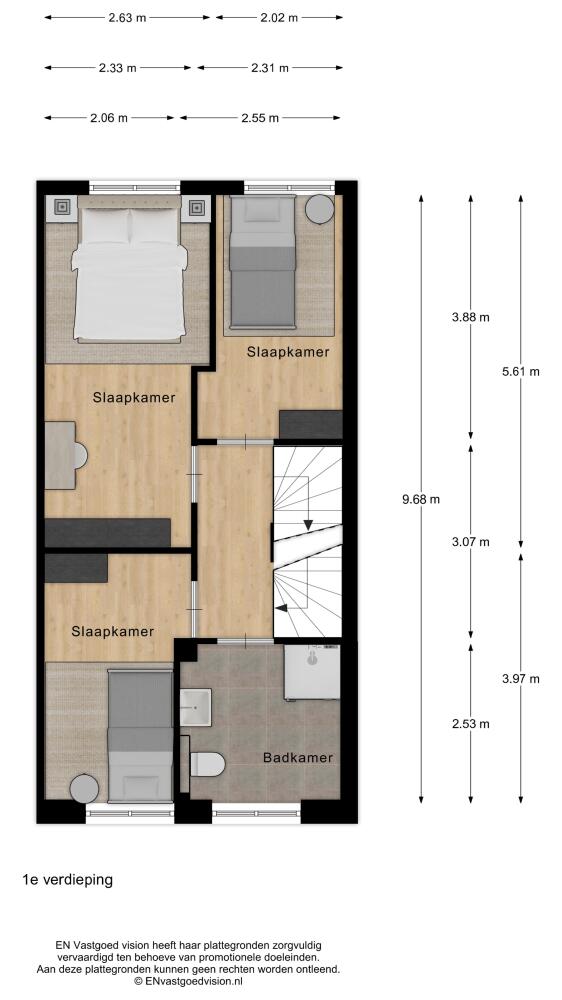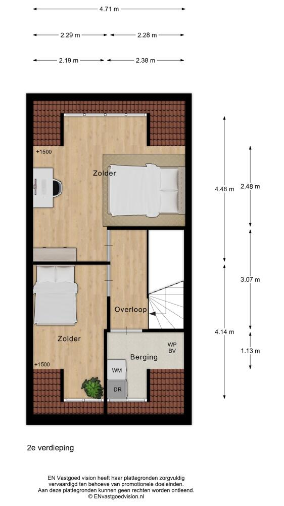 Tweede verdieping: overloop. (Technische en facilitaire ruimte met aansluitingen wasmachine en -droger.) Mogelijkheid geheel open doorzonvertrek als vierde of uitbreiding met vijfde slaapkamer.