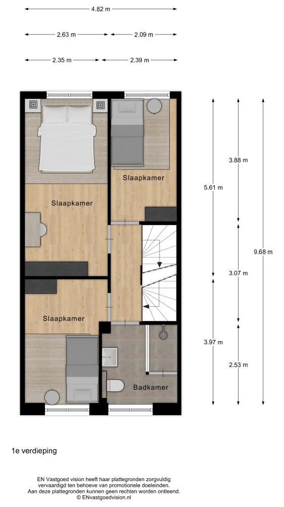 Tweede verdieping: overloop. [Technische en facilitaire ruimte met aansluitingen wasmachine en -droger.] Mogelijkheid geheel open doorzonvertrek als vierde of uitbreiding met vijfde slaapkamer.