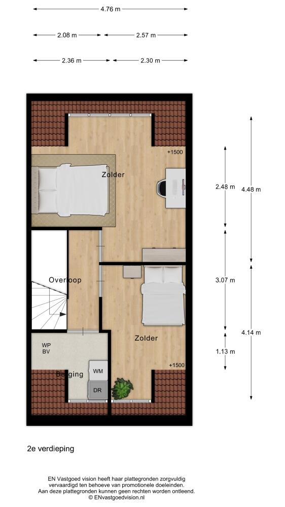 Tweede verdieping: overloop. [Technische en facilitaire ruimte met aansluitingen wasmachine en -droger.] Mogelijkheid geheel open doorzonvertrek als vierde of uitbreiding met vijfde slaapkamer.