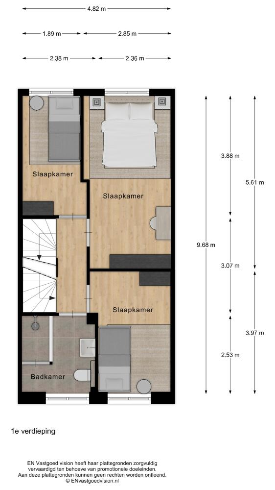 Eerste verdieping: overloop met vaste trap naar tweede verdieping. Drie slaapkamers en badkamer, standaard voorzien van betegeling, wastafel en inloopdouche.