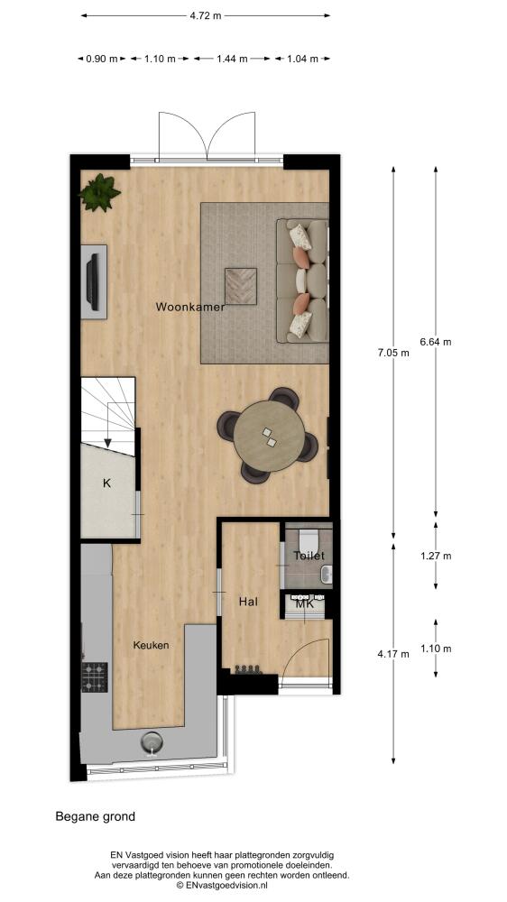 Begane grond: verhoogd inpandig portiek door de uitbouw met erker. Hardstenen stoep en gemetselde plantenbak. Hardhouten voordeur in jaren '30 stijl. Hal met meterkast. Toiletruimte met wandcloset en fontein. Doorgang naar woonkamer met open keuken, casco op te leveren inclusief leidingwerk en aansluitingen elektra (berekend op koken). Open trap. Tuingerichte woonkamer met dubbele openslaande deuren naar achtertuin op het zuidwesten, voorzien van separate berging (5 m2).