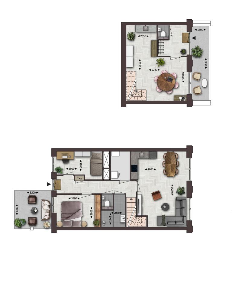 Dit type beschikt over twee buitenruimtes: een terras van circa 11 m²/22 m² op de eerste verdieping, en op de begane grond een Delftse stoep van circa 10 m² met een tuinmuurtje aan de kopse kanten van de stoep. De entreedeur bevindt zich op eerste verdieping aan de zijde van het terras, de werk-/