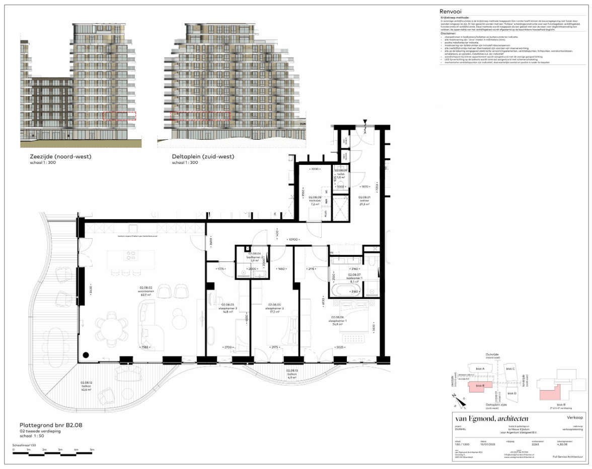 Type B2 - In toren Lunaris bevindt zich een aantal appartementen van het woningtype B2. Op een prominente hoekligging, tussen het Deltaplein en de richting van het strand, kenmerken deze appartementen zich door een aantrekkelijk samenspel van uitzicht, levendigheid en openheid. Het royale terras van ca. 43 m2 is voornamelijk georiënteerd op het zuidwesten. Dit betekent dat je vanaf ongeveer 12.00 uur tot laat in de avond van de zon geniet. De ideale plek voor wie houdt van buiten lunchen, borrelen of uitgebreid dineren met zicht op zee en de sfeer van het plein op de achtergrond.